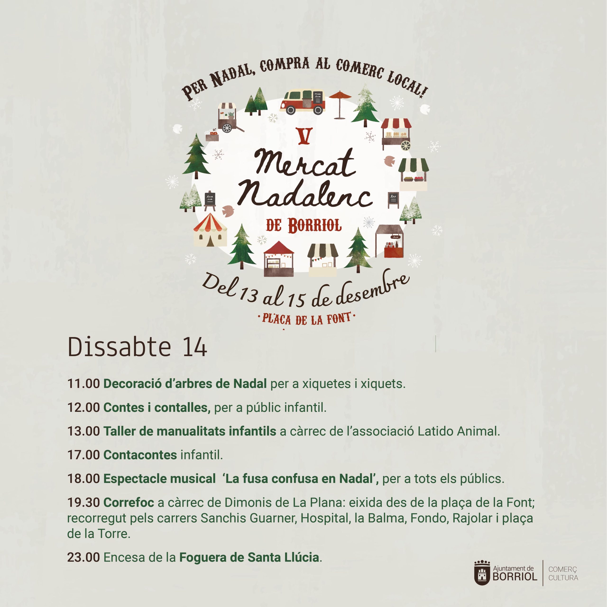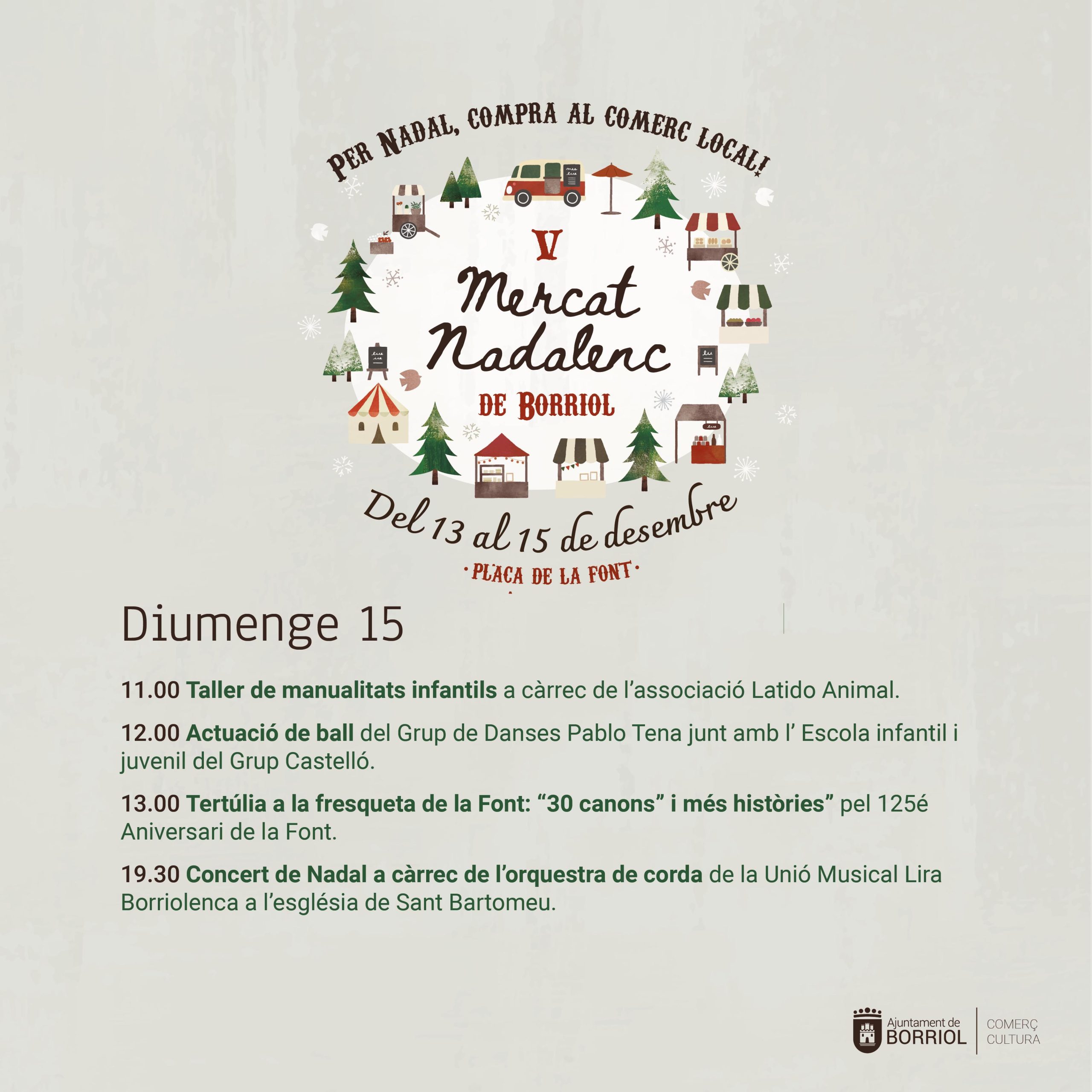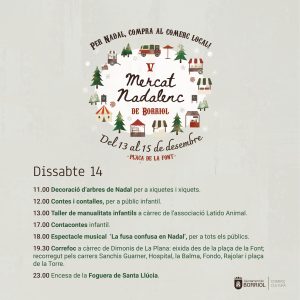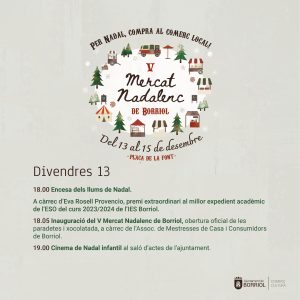 🎄🎅🏼 🛍️ El pròxim divendres 13 de desembre s’inaugurarà el V Mercat Nadalenc en el que participaran els següents comerços i entitats amb paradetes i moltes activitats durant tot el cap de setmana: Taller de costura Rocío Arce, Nuria Peques, AECC, Detalls, Permusic, La Tendeta, Latido Animal Borriol, Assoc. de Mestresses de Casa i Consumidors de Borriol, La Morena, Editorial El Planter, Cáritas, Hermanos Chiva, Floristeria Vimar, Ruralketing, IES Borriol – 4t d’ESO, AFA CEIP L’Hereu i alumnat de 6é, Grup de Danses Pablo Tena, Unió Musical Lira Borriolenca, Borriol Jove i Tourist info Borriol.